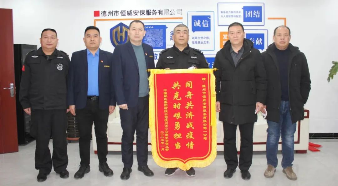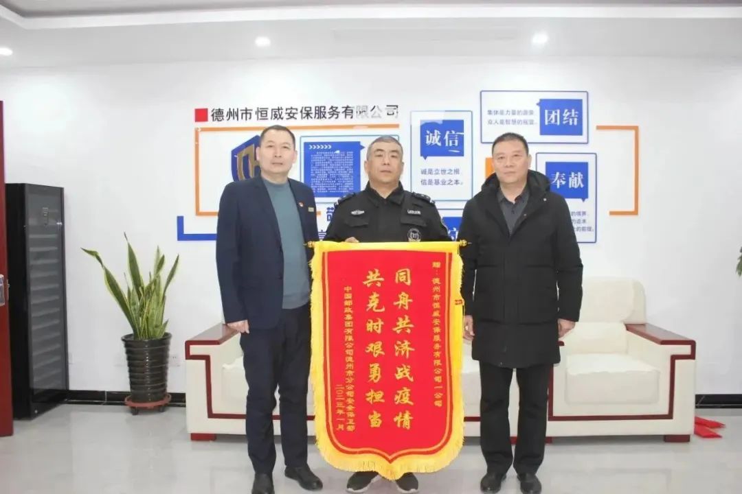 1月17日,中國郵政集團有限公司德州市分公司徐峰主任一行到訪德州市恒威安保服務(wù)有限公司并贈送錦旗,贊揚恒威安保駐郵政集團德州分公司班組履職盡責(zé)、踏實認真、勇于擔當,特別是在疫情期間安保人員24小時堅守工作崗位,嚴格防疫,切實為我公司安全有序運轉(zhuǎn)提供了有力的安全保障,對恒威安保人所做出的努力及無私奉獻、敬業(yè)忘我的出色表現(xiàn)表示充分肯定和衷心感謝。