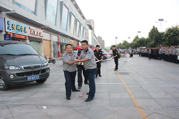 7月27日上午8時(shí)30分,人防一大隊(duì)接客戶單位天衢路中國(guó)銀行求助電話后,立即通知大隊(duì)?wèi)?yīng)急搶險(xiǎn)分隊(duì)30名保安隊(duì)員在第一時(shí)間趕赴現(xiàn)場(chǎng)。大隊(duì)長(zhǎng)王新剛,一中隊(duì)、三中隊(duì)中隊(duì)長(zhǎng)李明、孫輝國(guó)在下達(dá)集結(jié)指令的同時(shí)也快速抵達(dá)。