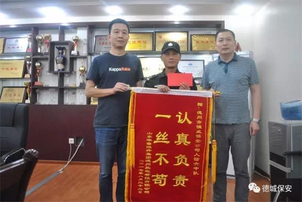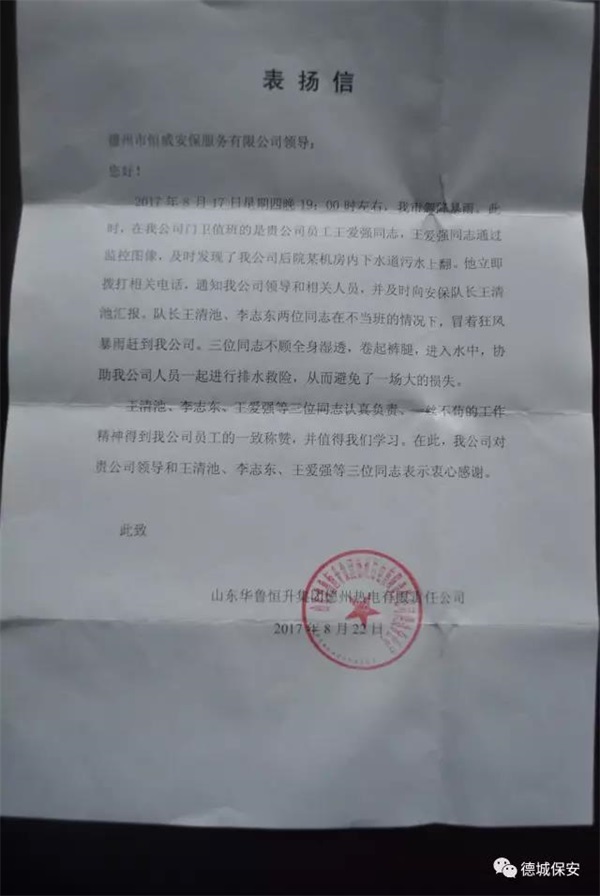 8月28日上午,山東華魯恒升集團(tuán)德州熱電有限責(zé)任公司安保部段主任在派駐保安執(zhí)勤班班長王清池的陪同下,來到德州市恒威安保服務(wù)有限公司,感謝在8.17特大暴雨中及時排除重大險情的三名保安隊員。贈送“一絲不茍、認(rèn)真負(fù)責(zé)”錦旗一面、表揚(yáng)信一封。