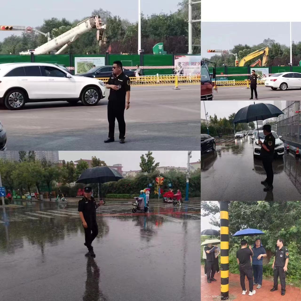 一公司承接多處道路交通協(xié)管勤務(wù)且點(diǎn)位較為分散,7月28日下午,副總經(jīng)理王洪林深入勤務(wù)現(xiàn)場(chǎng),與交警部門積極對(duì)接,對(duì)執(zhí)勤點(diǎn)位安全隱患進(jìn)行排查,并要求各分管隊(duì)長(zhǎng)務(wù)必高度重視,對(duì)存在安全隱患的警示牌,迅速對(duì)接施工方對(duì)其進(jìn)行加固,以免發(fā)生事故,同時(shí)叮囑隊(duì)員們?cè)谧龊米陨矸雷o(hù)的前提下,嚴(yán)格落實(shí)好各項(xiàng)防汛舉措,確保道路安全暢通。由于城區(qū)突降大雨,加之正值下班高峰時(shí)段,車流量不斷加大,車輛通行緩慢,王洪林也加入交通疏導(dǎo)隊(duì)伍,與隊(duì)員們一起冒雨疏導(dǎo)過往車輛,緩解交通通行壓力。