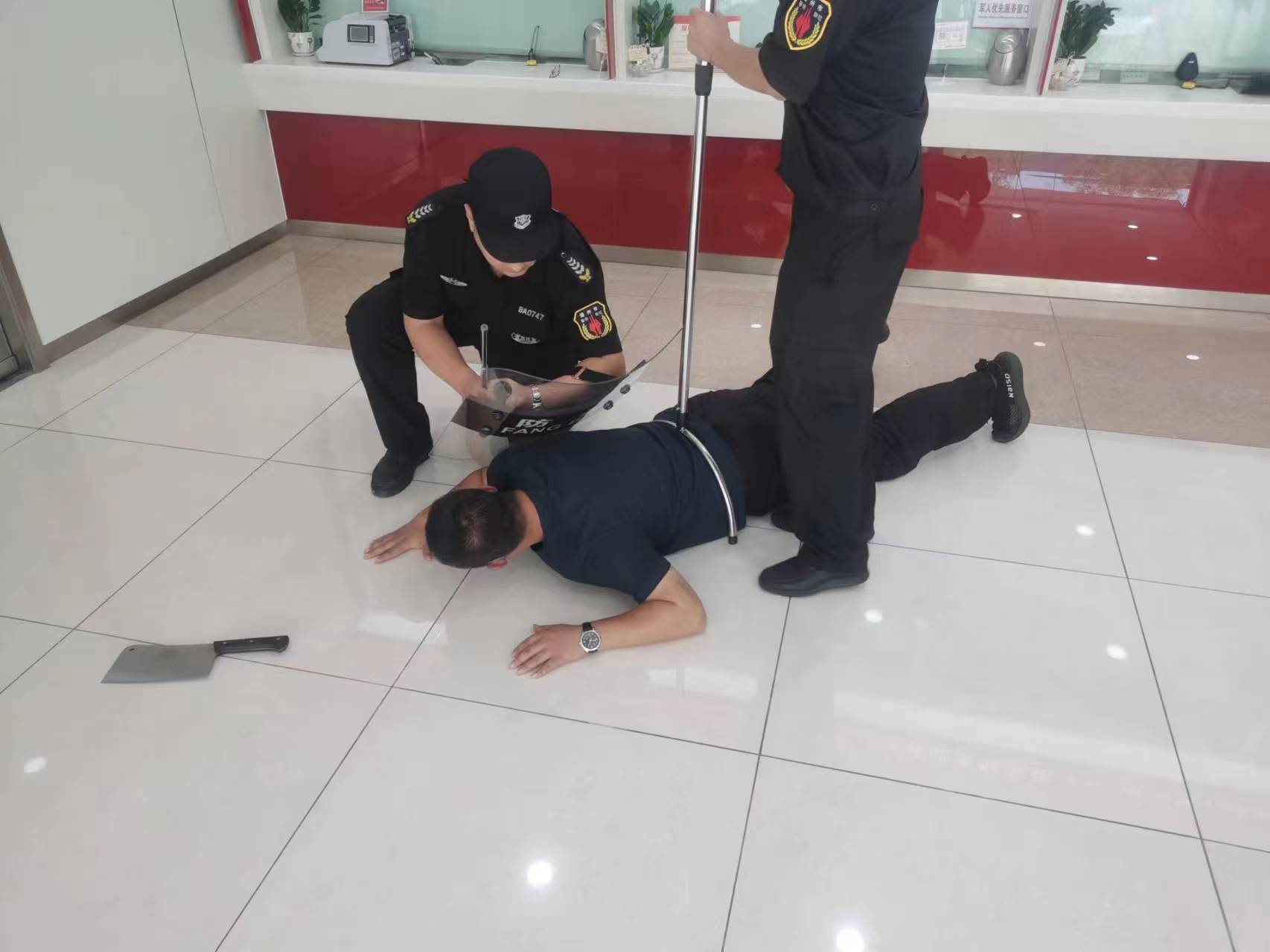 演練開始,“歹徒”攜帶刀具沖進營業(yè)廳企圖傷人,危害客戶與銀行工作人員人身安全,面對“歹徒”威脅,保安隊員沉著冷靜勸說“歹徒”,同時組織安保人員對其攔截,有序疏散人員并及時報警,最終在保安與工作人員的緊密配合下將“歹徒”成功控制,保證了人員和財物的安全。
