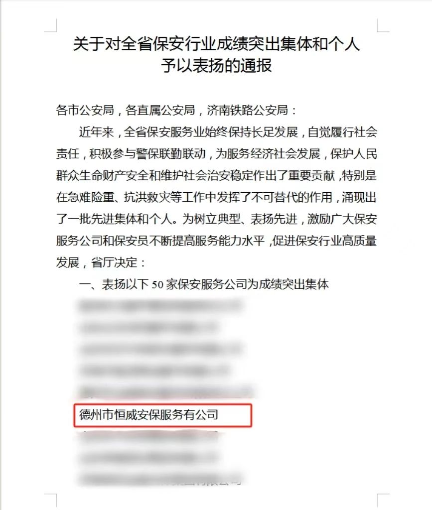 【喜報(bào)】德州恒威安保被山東省公安廳授予“全省保安行業(yè)成績突出集體”榮譽(yù)稱號