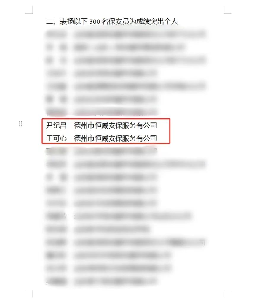近日,山東省公安廳印發(fā)《關(guān)于對全省保安行業(yè)成績突出集體和個(gè)人予以表揚(yáng)的通報(bào)》,德州市恒威安保服務(wù)有限公司榮獲2023年度“全省保安行業(yè)成績突出集體”榮譽(yù)稱號;公司員工尹紀(jì)昌、王可心榮獲“成績突出個(gè)人”。