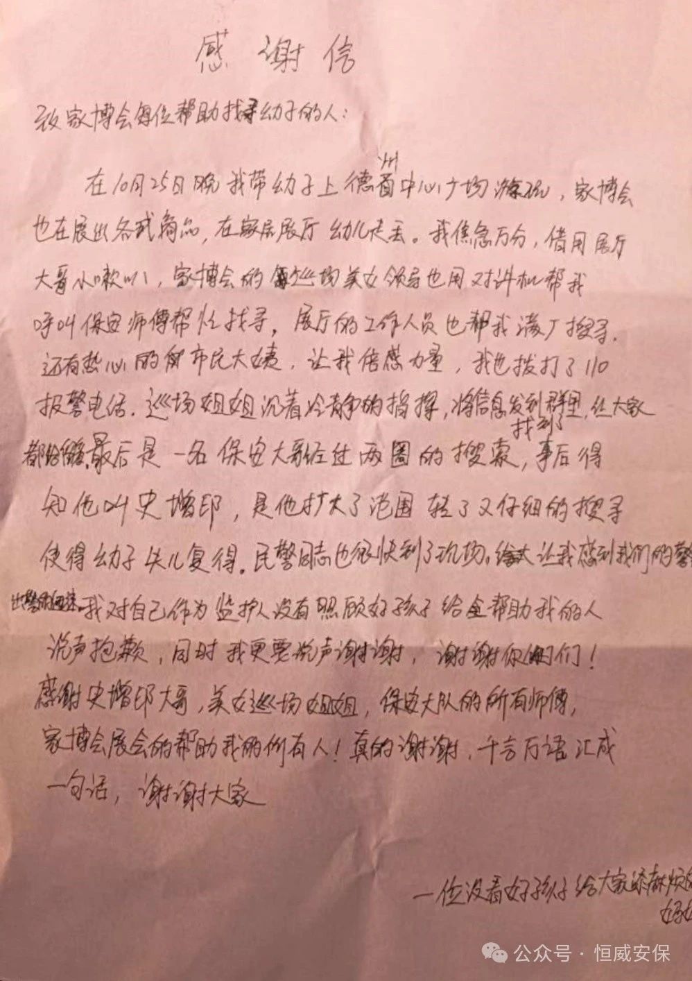由于展會占地面積較廣,又正值周末,人流量很大,無形中增加了尋找難度。隊員們圍繞著孩子走失的位置,分散開來擴大范圍繼續(xù)尋找,終于找到了走失的幼童。孩子媽媽對恒威保安員及家博會工作人員的幫助表示了衷心的感謝。同時,家博會主辦方也對恒威執(zhí)勤工作人員的果斷和擔當給予了高度贊賞。