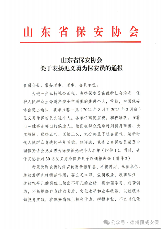 【喜報(bào)】公司3名見義勇為保安員獲山東省保安協(xié)會(huì)通報(bào)表?yè)P(yáng)