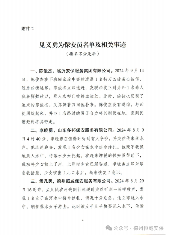 近日,山東省保安協(xié)會(huì)發(fā)布《關(guān)于表?yè)P(yáng)見義勇為保安員的通報(bào)》,對(duì)30名見義勇為保安員先進(jìn)個(gè)人進(jìn)行通報(bào)表?yè)P(yáng),公司于林成等3名見義勇為保安員獲表?yè)P(yáng)!