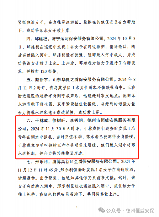 德州市恒威安保服務(wù)有限公司保安員于林成、徐樹旺、李秀明同志,在2024年11月30日清晨6時(shí)許,于德城區(qū)新湖景區(qū)例行巡查時(shí),展現(xiàn)出英勇無(wú)畏、見義勇為的精神,成功救助一名落水青年。這一事跡充分體現(xiàn)了新時(shí)代保安員的責(zé)任感和使命感,弘揚(yáng)了社會(huì)正氣。