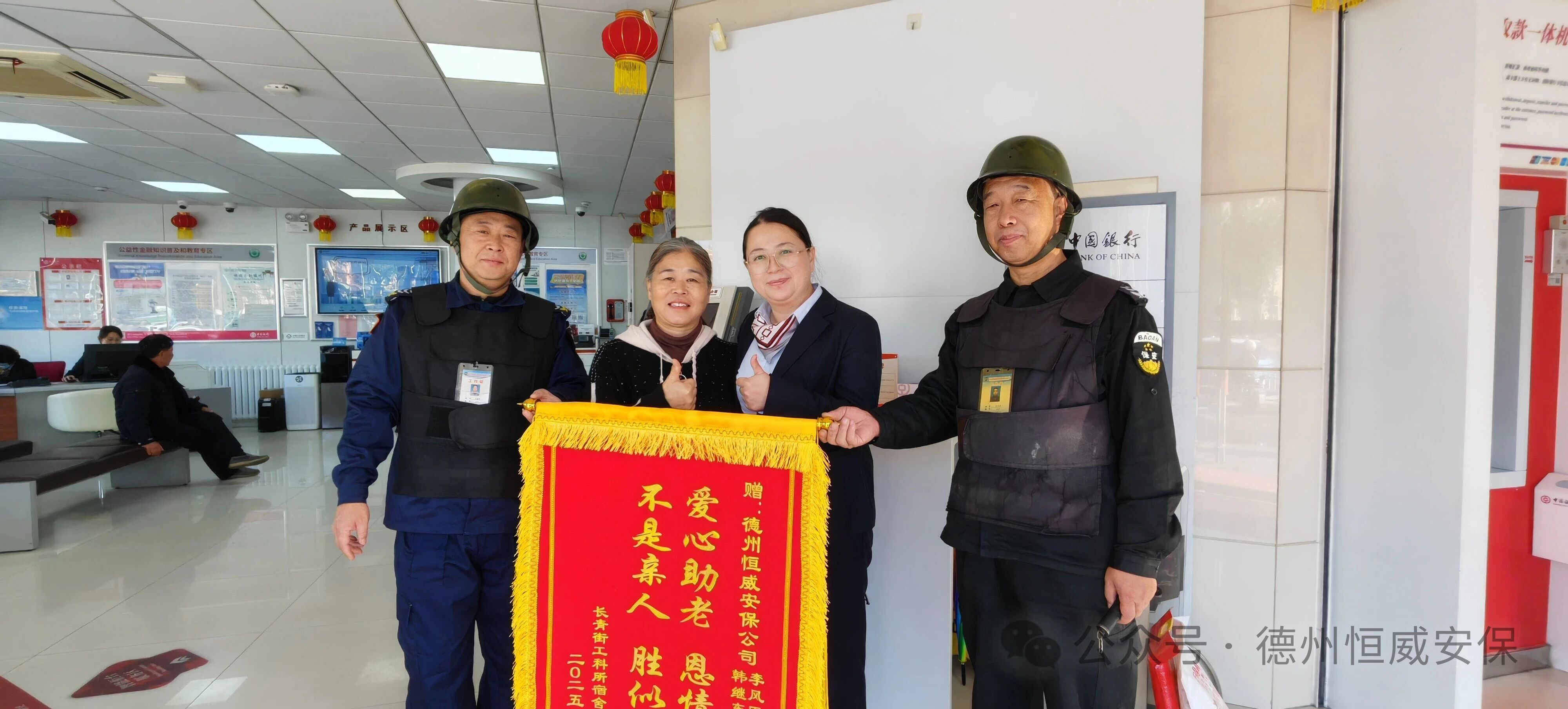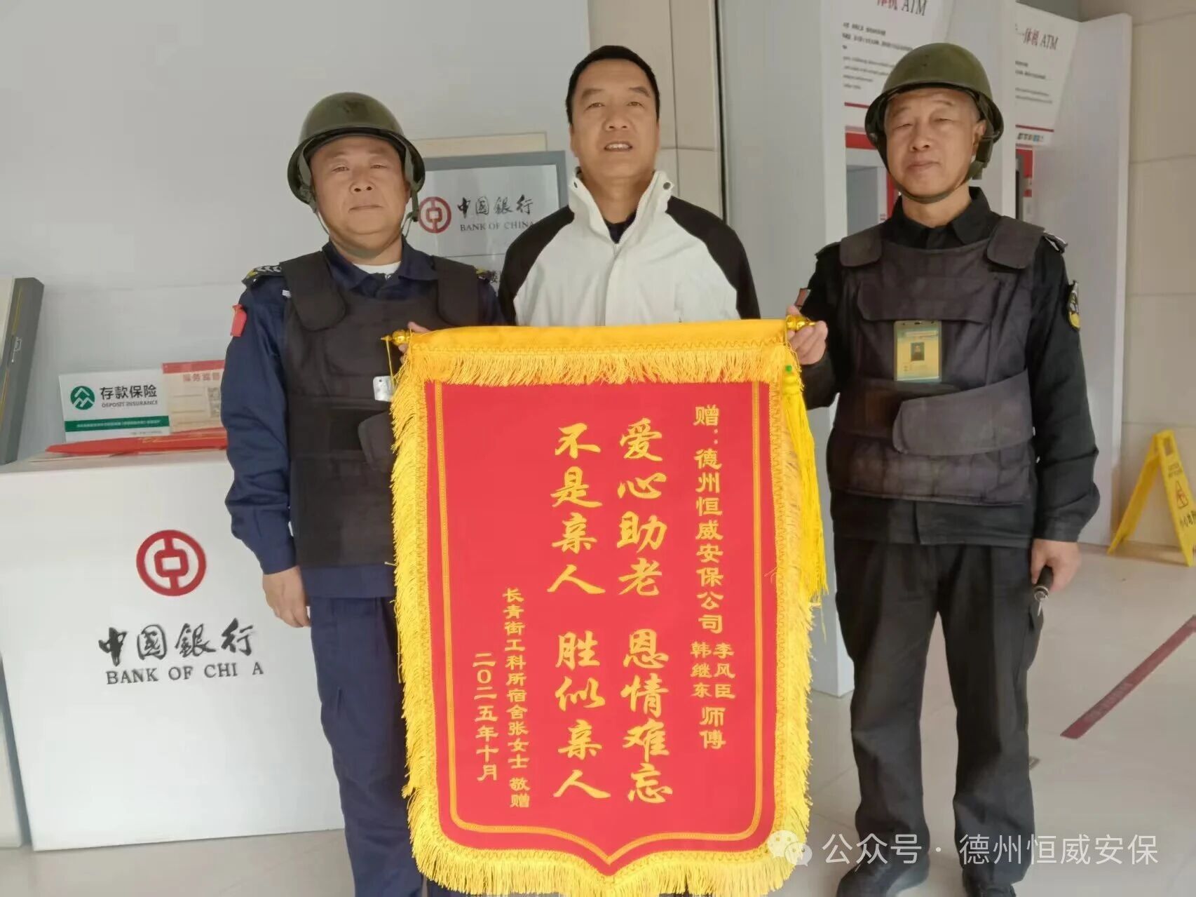 近日,家住長青街工科所宿舍的張女士專程來到中國銀行新湖支行網(wǎng)點,將一面印有“愛心助老,恩情難忘,不是親人,勝似親人”的錦旗交到駐點保安員李風(fēng)臣和韓繼東手中,以此感謝他們對家中八旬母親的及時救助與溫情守護。