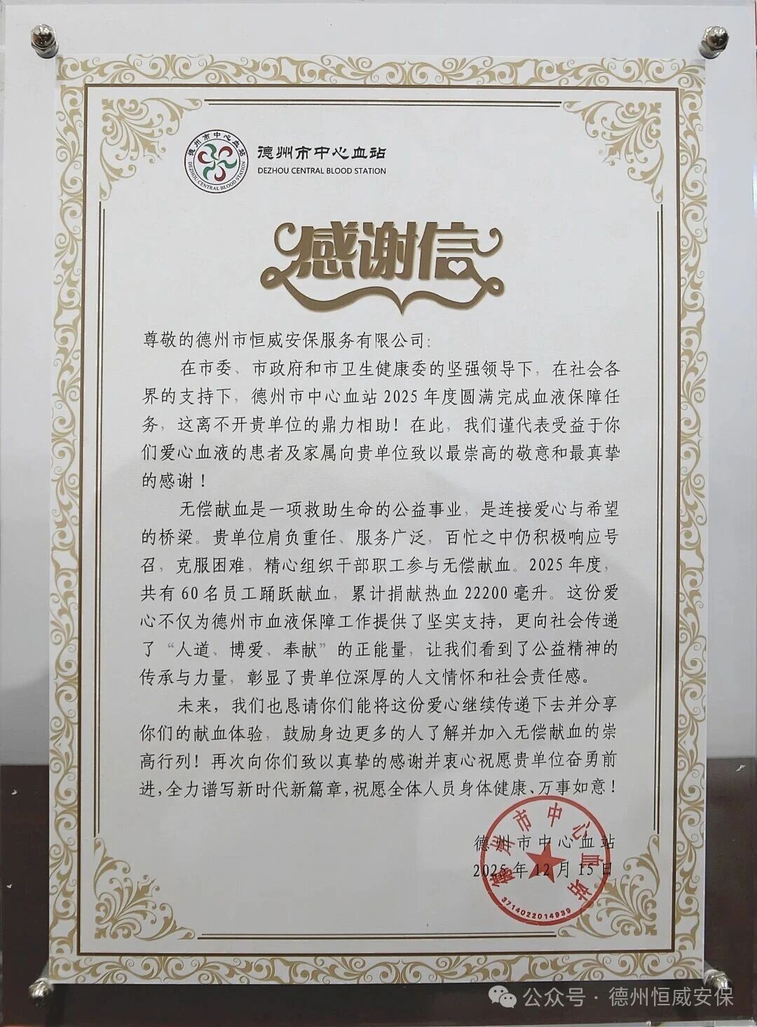 信中強(qiáng)調(diào),無(wú)償獻(xiàn)血是連接愛心與希望的生命橋梁。恒威安保公司雖肩負(fù)重任,卻能長(zhǎng)期堅(jiān)持,克服困難,精心動(dòng)員組織。僅在2025年度,公司就有60名干部職工踴躍伸出臂膀,累計(jì)捐獻(xiàn)熱血22200毫升。這一組沉甸甸的數(shù)字,不僅有效補(bǔ)充了血液庫(kù)存,更向社會(huì)廣泛傳遞了“人道、博愛、奉獻(xiàn)”的正能量,彰顯了企業(yè)深厚的人文情懷和強(qiáng)烈的社會(huì)責(zé)任感。